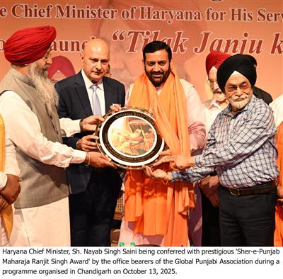 Chandigarh, October 13 – Haryana Chief Minister Sh. Nayab Singh Saini was today honoured with the prestigious “Sher-e-Punjab Maharaja Ranjit Singh Award” by the “Global Punjabi Association.” This honour was conferred upon him in recognition of his inspiring leadership, commitment to social harmony, and continuous efforts for the welfare of the Sikh community in Haryana.