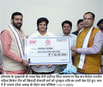 Chandigarh, November 12 – Haryana Chief Minister Sh. Nayab Singh Saini honoured Shafali Verma, a player of the 2025 World Cup-winning Indian Women’s Cricket Team, with a cheque of Rs 1.50 crore and a Grade-A gradation certificate for her outstanding performance. In addition, the Haryana State Commission for Women has appointed cricketer Shafali Verma as its Brand Ambassador.