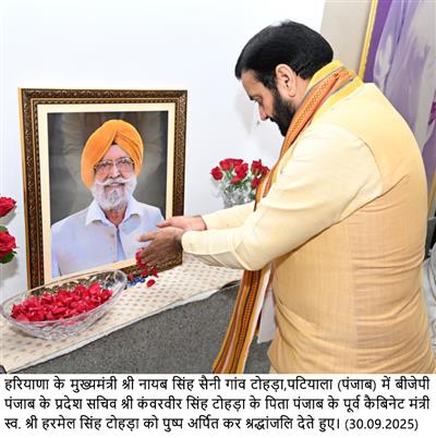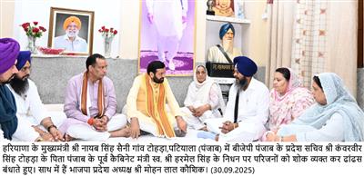 Chandigarh, September 30 – Haryana Chief Minister Sh Nayab Singh Saini on Tuesday visited village Tohra in Patiala district, Punjab to offer condolences on the demise of Sardar Harmel Singh Tohra, former Punjab Cabinet Minister and father of Punjab BJP State Secretary Sh Kanwarveer Singh Tohra. Haryana BJP State President Sh Mohan Lal Badoli also accompanied him.
