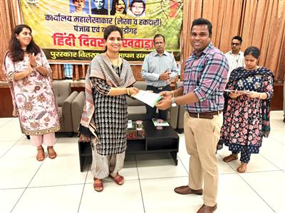 चण्डीगढ़, 01.10.25- : कार्यालय महालेखाकार (लेखा व हकदारी) पंजाब एवं चण्डीगढ़ में मनाए गए हिंदी पखवाड़े के दौरान विभिन्न प्रतियोगिताएं आयोजित की गईं जिनमें निबंध प्रतियोगिता, शब्द ज्ञान प्रतियोगिता, आशु भाषण प्रतियोगिता, हिंदी कविता पाठ प्रतियोगिता और अधिकारी वर्ग के लिए प्रशासनिक शब्दावली तथा हिंदी सामान्य ज्ञान प्रतियोगिता का आयोजन किया गया। पुरस्कार वितरण तथा समापन समारोह में विजेता प्रतिभागियों को महालेखाकार ने पुरस्कृत किया।