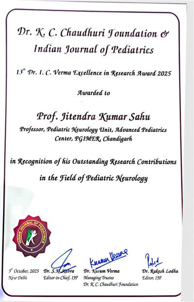 CHANDIGARH, 06.10.25-Professor Jitendra Kumar Sahu, a renowned pediatric neurologist at PGIMER, Chandigarh, has been awarded the prestigious “Dr. I. C. Verma Excellence in Research Award 2025”. It is a National Professional Award bestowed by Indian Journal of Pediatrics to pediatricians under 50 years of age for outstanding research contributions.