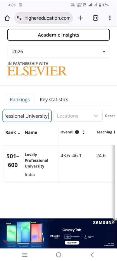 Jalandhar, 11.10.25-; Lovely Professional University (LPU) has reached an unprecedented high in global academia, achieving the 5th position among all universities in India and securing a place in the coveted Global Band of 501-600 in the Times Higher Education (THE) World University Rankings 2026.