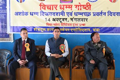 चंबा, अक्तूबर 14-उपायुक्त मुकेश रेपसवाल आज अशोक धम्म विजयदशमी एवं धम्मचक्र परिवर्तन दिवस के अवसर पर विद्या महेश चैरिटेबल ट्रस्ट के तत्वावधान तथा शेड्यूल कास्ट वेलफेयर एसोसिएशन चंबा के सौजन्य से अंबेडकर भवन सुलतानपुर में आयोजित विचार धम्म गोष्ठी में मुख्य अतिथि उपस्थित हुए।