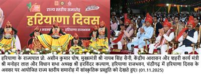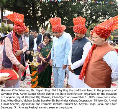 Chandigarh, November 1 – The 60th Foundation Day of Haryana was celebrated today with great enthusiasm and joy at the Haryana Raj Bhavan. The ceremony commenced with the lighting of the ceremonial lamp by Haryana Governor Prof. Ashim Kumar Ghosh, his wife Smt. Mitra Ghosh, and Chief Minister Sh. Nayab Singh Saini. Union Minister Sh. Manohar Lal was also present on the occasion. The Governor announced a grant of Rs 6 lakh for the artists who participated in the event.
