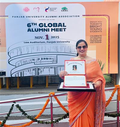 CHANDIGARH, 02.11.25-Dr. Neeza Singh, Librarian of T.S. Central State Library, Chandigarh, has been awarded the prestigious Distinguished Alumnus Award by Panjab University, Chandigarh, during the 6th Global Alumni Meet held on 1 November 2025. This award recognizes her exceptional contributions and leadership in the field of library and information science.