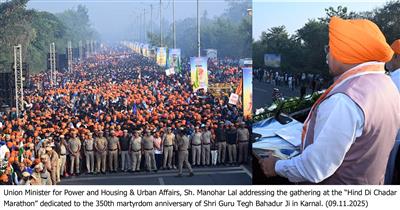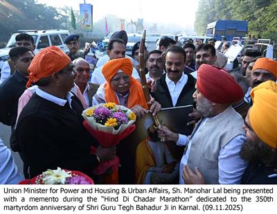 Chandigarh, November 9 — Union Minister for Housing, Power and Urban Affairs, Sh. Manohar Lal said the supreme sacrifice of ‘Hind Di Chadar’ Guru Tegh Bahadur Ji inspires us to work selflessly for society, religion, and the nation.