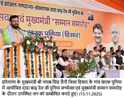 Chandigarh, November 15 – Haryana Chief Minister Sh. Nayab Singh Saini, while addressing a program organized to commemorate the birth anniversary of Dada Badhdev Poonia, announced that the existing school in Kharak Punia village will be upgraded to a Sanskriti Model School, ensuring high-quality education for children within the village. In addition, the Chief Minister announced the construction of a community center and the establishment of a library in Kharak Punia village.