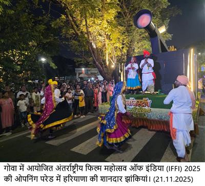 Chandigarh, November 21 – Haryana presented its first-ever state tableau in the opening parade of the International Film Festival of India (IFFI) 2025, held in Goa. This year, IFFI replaced its traditional opening ceremony with a spectacular and captivating “street parade”, offering audiences a unique “moving festival” filled with the colours of Indian culture and cinema.