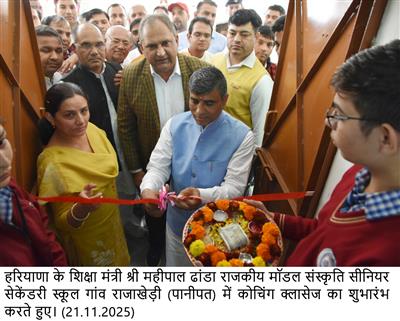 Chandigarh, November 21 – Haryana Education Minister Mr. Mahipal Dhanda today launched coaching classes at Government Model Sanskriti Senior Secondary School, Village Rajakhedi (Panipat), and formally inaugurated a state-of-the-art language lab and library.