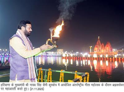 Earlier, Chief Minister Nayab Singh Saini, Cabinet Minister Krishan Kumar Bedi, Chief Secretary Anurag Rastogi, Director General of the Information, Public Relations and Languages Department K M Pandurang, and former Minister of State Subhash Sudha performed the Maha Aarti at Brahma Sarovar and offered their reverence to the Gita. The Chief Minister said that the Gita is a spiritual guide that teaches how to live life and embodies the essence of the Vedas. He explained that God created the four Vedas through four sages, and that their knowledge was passed down through the Upanishads, ultimately finding expression in the Gita.