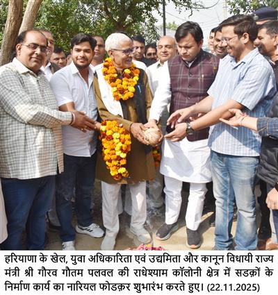 Chandigarh, November 22 – Haryana’s Minister of State for Sports, Youth Empowerment & Entrepreneurship Sh. Gaurav Gautam today formally inaugurated the construction work of all roads in the Radheyshyam Colony area of Palwal.