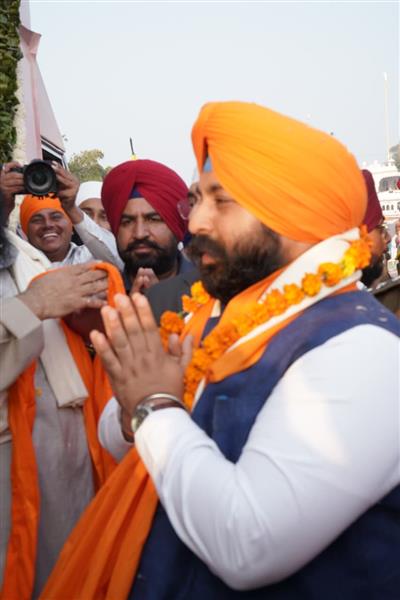 Sri Anandpur Sahib/Chandigarh, November 22:The magnificent Nagar Kirtan dedicated to the 350th martyrdom anniversary of Sri Guru Tegh Bahadur Ji, which began from Faridkot, was accorded warm and grand welcome by Cabinet Minister Harjot Singh Bains and Member of Parliament Malwinder Singh Kang upon its arrival at Sri Anandpur Sahib.