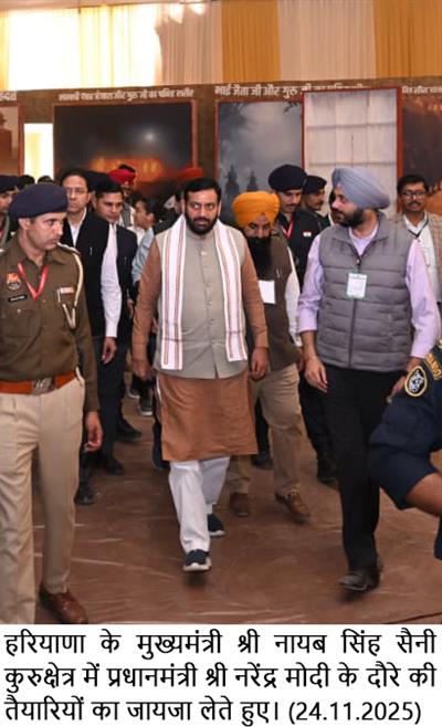 Chandigarh, November 24 — The Haryana Government is organizing a grand state-level congregation today at Jyotisar (Kurukshetra) on the occasion of the 350th Martyrdom Day of Sri Guru Tegh Bahadur Ji. On this occasion, Prime Minister Sh. Narendra Modi will arrive in Kurukshetra to seek the blessings of the Guru Sahib. Chief Minister Sh. Nayab Singh Saini, along with other ministers and dignitaries, will also be present. In addition, the Prime Minister will inaugurate the Mahabharata Anubhav Kendra located at Jyotisar and will also participate in the Maha Aarti at the holy Brahma Sarovar during the International Gita Mahotsav.