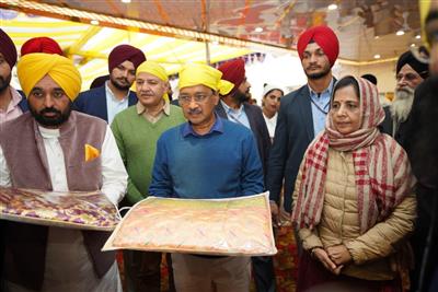 Sri Anandpur Sahib, November 24-Punjab Chief Minister Bhagwant Singh Mann and National Convener of AAP Arvind Kejriwal on Monday paid obeisance at Gurdwara Takht Sri Kesgarh Sahib, Gurdwara Sheeshganj Sahib and Gurdwara Bhora Sahib to thank the Almighty for giving them enormous strength to pass historic resolution of declaring three Takhts as holy cities.