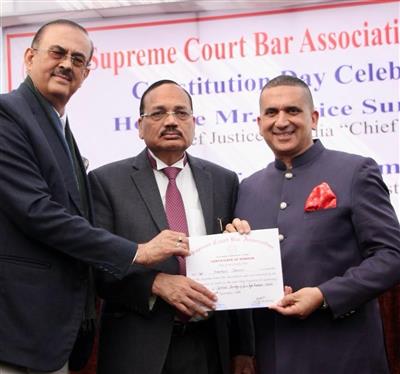 New Delhi, 26 November :Today the Hon’ble Chief Justice of India Mr. Justice Surya Kant, conferred “ Certificate of Honour “ to Harpreet Sandhu, State Information Commissioner, Punjab, on the solemn occasion of Constitution Day for his contribution in authoring book titled “Spiritual Journey of Guru Tegh Bahadur Sahib”, in the presence of Solicitor General of India Tushar Mehta and Hon’ble Judges of Supreme Court of India, President SCBA during the Constitution Law Day function held at Supreme Court , New Delhi.