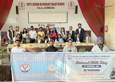 Ludhiana 26 November 2025-The College of Dairy and Food Science Technology, Guru Angad Dev Veterinary and Animal Sciences University, marked National Milk Day with two major activities—a Nutrition Awareness Drive at PAU Smart School and the release of a video addressing prevalent societal myths about milk.