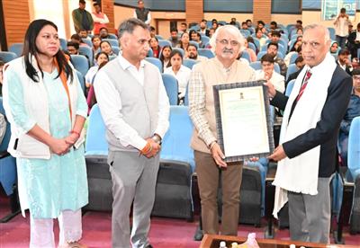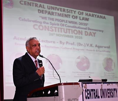 CHANDIGARH, 26.11.25-The Department of Law, Central University of Haryana (CUH), Mahendergarh, organized a special programme on the occasion of Constitution Day. Prof. V. K. Agarwal, Pro- Chancellor, Jagan Nath University, Jaipur graced the event as the Chief Guest, while the programme was presided over by the Pro Vice-Chancellor, Prof. Pawan Kumar Sharma. In his message, Vice-Chancellor Prof. Tankeshwar Kumar said that the Constitution is not merely a legal document but a guiding force for nation-building. He urged students to uphold democratic values and contribute responsibly to society.