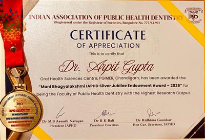 CHANDIGARH, 29.11.25-Demonstrating exceptional academic and research leadership in the field of Public Health Dentistry, Dr. Arpit Gupta, Additional Professor at the Oral Health Sciences Centre, Postgraduate Institute of Medical Education and Research (PGIMER), Chandigarh, has been honoured with the Mani Bhagyalakshmi IAPHD Silver Jubilee Endowment Award – 2025. This coveted national award is presented to the Public Health Dentistry faculty member with the highest research output across India. Dr. Gupta was felicitated at the 29th National Conference of the Indian Association of Public Health Dentistry (IAPHD) held in Mangalore.