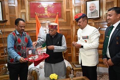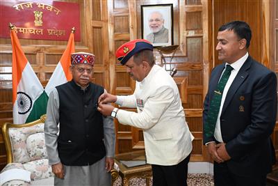 SHIMLA 7th December, 2025-Armed Forces Flag Day was observed at Raj Bhavan today. Director Sainik Welfare Department Brigadier Madan Sheel Sharma and Deputy Director Sainik Welfare Shimla and Kinnaur districts Lieutenant Commander Atul Chambial pinned the Armed Forces Flag on the Governor. On the occasion, the Governor Shiv Pratap Shukla conveyed his greetings on Flag Day and made a contribution towards Armed Forces Flag Day Fund.