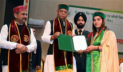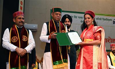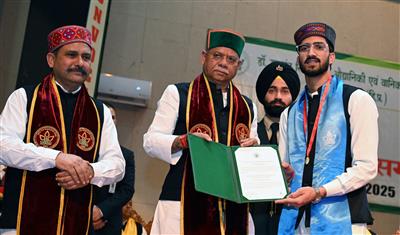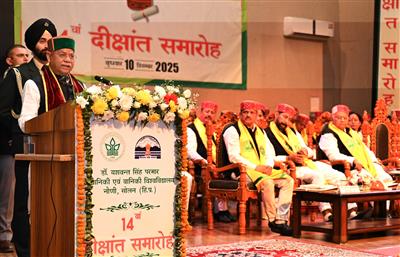 SOLAN,10.12.25-राज्यपाल श्री शिव प्रताप शुक्ल ने आज सोलन जिले के नौणी स्थित डॉ. यशवंत सिंह परमार औद्यानिकी एवं वानिकी विश्वविद्यालय (वाईएसपीयूएचएफ) के 14वें दीक्षांत समारोह की अध्यक्षता की। उन्होंने कुल 12 स्वर्ण पदक प्रदान किए, जिनमें से 9 स्वर्ण पदक छात्राओं को मिले। राज्यपाल ने 518 मेधावी प्रमाण पत्र तथा औद्यानिकी व वानिकी के 855 डिग्री वितरित कीं।