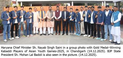 Chandigarh, December 14 – Chief Minister Sh. Nayab Singh Saini today met a delegation of Haryana players from the Indian boys’ and girls’ Kabaddi teams which won gold medals at the Asian Youth Games-2025 held in Bahrain. The meeting was held at his residence, Sant Kabir Kutir in Chandigarh. On this occasion, the Chief Minister congratulated the players and extended his best wishes to Captain Ishant Rathee and other players, warmly welcoming and felicitating them for their historic achievement.