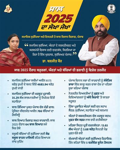 Chandigarh, December 19:Under the leadership of Chief Minister S. Bhagwant Singh Mann, the Punjab Government continues to implement people-centric policies aimed at ensuring the welfare of every section of society. During the year 2025 (Financial Year 2025–26), several landmark initiatives have been undertaken to strengthen the social and economic security of senior citizens, women, children and Persons with Disabilities. This was stated by Social Security, Women and Child Development Minister Dr. Baljit Kaur.