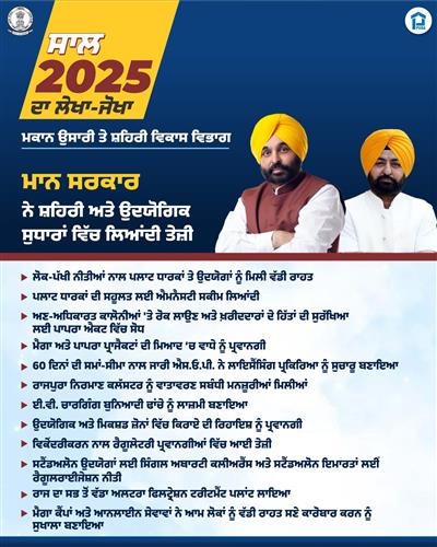 *Chandigarh, December 24:*Punjab Housing and Urban Development Minister S. Hardeep Singh Mundian today said that during the year 2025, the department introduced an Amnesty Scheme providing a long awaited window to plot holders who were unable to deposit instalments, complete construction within the stipulated period or deposit Non Construction Fee. The initiative was aimed at settling legacy issues and reinforcing public trust while maintaining planned urban growth.