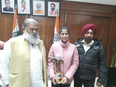 Chandigarh, December 14 - National hockey player Olympian Navneet Kaur met with Haryana's Energy, Transport, and Labour Minister Sh. Anil Vij at his office in Chandigarh today. During the meeting, Sh.Vij expressed pride in Olympian Navneet Kaur, captain of the Hero Hockey India League champions SG Pipers from Ranchi and the Championship's Best Player, and gave her his blessings.