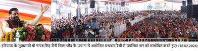 The Chief Minister was addressing a Dhanyavad Rally in Uchana, Jind district, on Wednesday. He was welcomed by the rally organizer and MLA from Uchana Assembly constituency, Sh. Devender Chaterbhuj Attri. Earlier, the Chief Minister inaugurated and laid the foundation stones of five development projects worth ₹103.31 crore, including three inaugurations worth ₹28.54 crore and two foundation stones worth ₹74.77 crore.