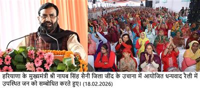 Chandigarh, February 18 — Haryana Chief Minister Sh. Nayab Singh Saini today inaugurated and laid the foundation stones of various development projects worth ₹103.31 crore during the Dhanyavad Rally held in Uchana, giving fresh momentum to the development of the Assembly constituency. The objective of the state government is to strengthen basic infrastructure in every region for the welfare of people.