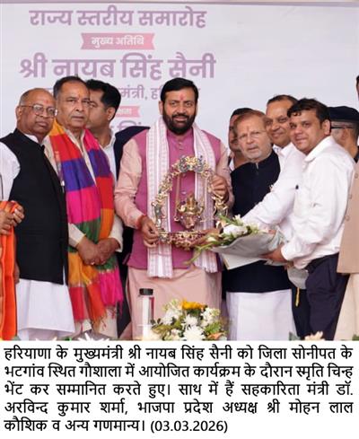Chandigarh, March 3 - Haryana Chief Minister, Sh. Nayab Singh Saini released Rs. 68.34 crore fodder grant for the empowerment of gaushalas in the state at a State-Level Gaushala Fodder Grant Distribution programme held in village Bhatgaon, Sonipat. On the occasion, he also extended greetings to the people of the state on the festival of Holi.