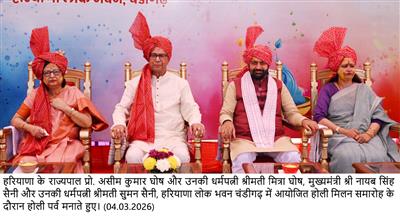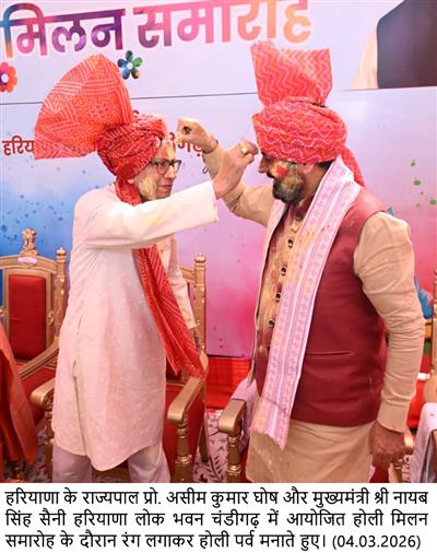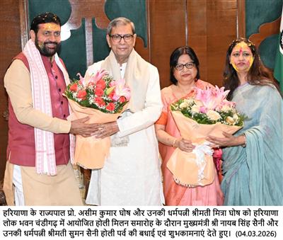 CHANDIGARH,04.03.26-हरियाणा के राज्यपाल प्रो. असीम कुमार घोष और उनकी धर्मपत्नी श्रीमती मित्रा घोष को हरियाणा लोक भवन चंडीगढ़ में आयोजित होली मिलन समारोह के दौरान मुख्यमंत्री श्री नायब सिंह सैनी और उनकी धर्मपत्नी श्रीमती सुमन सैनी होली पर्व की बधाई एवं शुभकामनाएं देते हुए।