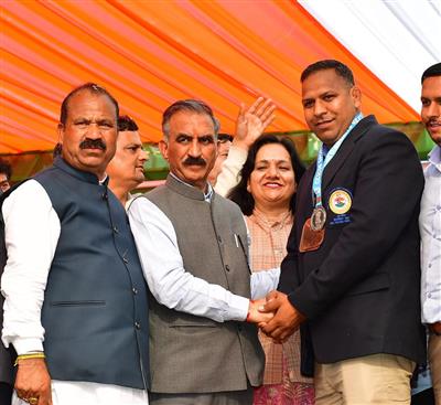 2. Chief Minister Thakur Sukhvinder Singh Sukhu honouring Jitender Chauhan wrestler, who won Bronze medal in Asian Grappling Championship, at Diagari in Mandi district today.