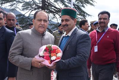 हिमाचल प्रदेश विधान सभा सचिवालय पहुँचने पर हि0प्र0 सरकार के उप-मुख्य सचेतक केवल सिंह पठानिया गुलदस्ता भेंट कर विधान सभा अध्यक्ष कुलदीप सिंह पठानियां का स्वागत करते हुए। गौरतलब है कि ब्रेक के बाद 14वीं विधान सभा के 11वें सत्र का दूसरा चरण आज आरम्भ हुआ है।