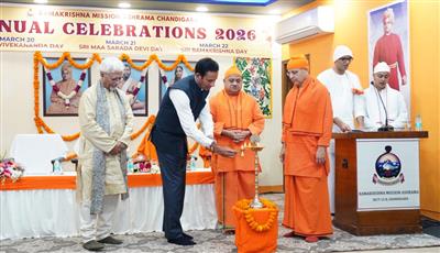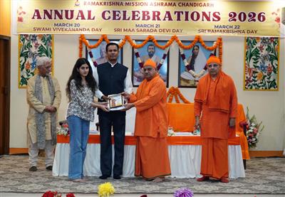 Chandigarh, March 20:The first day of the three-day annual celebration at Ramakrishna Mission Ashram, Chandigarh, was observed as Swami Vivekananda Day with devotion and enthusiasm at the Ashram premises. The programme began with a welcome address by the Secretary of the Ashram, Swami Bhitiharanandaji, who stated that the Ashram has been serving society since 1958 through value-based education, spiritual retreats, a mobile dispensary for nearby villages, a students’ hostel and a library. He urged everyone to cultivate firmness, love and a spirit of service in their hearts in accordance with the teachings of Swami Vivekananda.