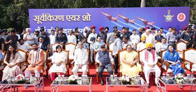 Chandigarh, March 28:The air show at Sukhna Lake was witnessed by several distinguished dignitaries, including Shri Gulab Chand Kataria, Governor of Punjab and Administrator, U.T. Chandigarh, along with his wife Smt. Anita Kataria; Professor Ashim Kumar Ghosh, Governor of Haryana, along with his wife Smt. Mitra Ghosh; Shri Bhagwant Mann, Chief Minister of Punjab, along with his wife Smt. Gurpreet Kaur; Shri Nayab Singh Saini, Chief Minister of Haryana, along with his wife Smt. Suman Saini; and Justice Sheel Nagu, Chief Justice of the Punjab and Haryana High Court. Shri H. Rajesh Prasad, Chief Secretary, UT Chandigarh, and Shri K.A.P. Sinha, Chief Secretary, Punjab, along with other senior officials of Chandigarh, Punjab & Haryana, were also present. They watched and enjoyed the ‘Suryakiran Aerobatic Display’ of the Indian Air Force and interacted with officials and spectators who had gathered in large numbers to see the performance. Their presence made the event more special and showed appreciation for the skill and professionalism of the Indian Air Force.