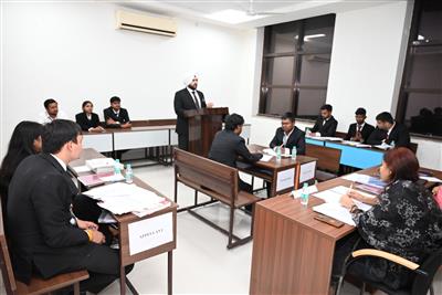 Addressing the gathering, Prof. Anand Sharma emphasized that moot courts serve as an invaluable platform for young budding lawyers to refine their advocacy skills, which would prove instrumental in their future growth in the legal field. Drawing upon the profound concepts of justice and Nyaya, he motivated students to dedicate themselves to ensuring justice reaches the disadvantaged sections of society. Mr. Rakesh Mehta, the Guest of Honour, enriched the session with his practical insights, encouraging participants to embrace the spirit of rigorous legal practice.