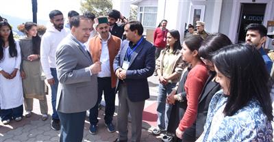 शिमलाः 01.04.26-आज पूर्वाह्न 10:30 बजे विधान सभा सचिवालय में बजट सत्र के दूसरे चरण की 12वें दिन की कार्यवाही देखने आए डी0ए0वी0 स्कूल लक्कड़ बाजार शिमला तथा हि0प्र0 विश्वविद्यालय शिमला पत्रकारिता विभाग के छात्र छात्राओं ने सदन की कार्यवाही को देखने से पहले हि०प्र० विधान सभा अध्यक्ष कुलदीप सिंह पठानियां से कौसिल चैम्बर के बाहर मुलाकात की। इस अवसर पर छात्रों ने विधान सभा अध्यक्ष से आज होने वाली कार्यवाही तथा विधान सभा की भूमिका, गठन तथा स्पीकर पद के महत्व पर प्रकाश डालने का आग्रह किया जिसका विधान सभा अध्यक्ष ने सिलसिलेवार उत्तर देते हुए कहा कि विधान सभा एक राज्य का कानून बनाने वाला सदन है। जैसे हमारे स्कूल में अलग-अलग कक्षाएं होती हैं, वैसे ही राज्य में अलग-अलग निर्वाचन क्षेत्र होते हैं, और हर निर्वाचन क्षेत्र से एक नेता बुना जाता है, जिसे विधायक कहते हैं। ये विधायक मिलकर विधान सभा बनाते हैं। विधान सभा का मुख्य काम राज्य के लोगों के लिए कानून बनाना है। जैसे स्कूल में नियम होते हैं. वैसे ही राज्य को चलाने के लिए कानून जरूरी होते हैं।