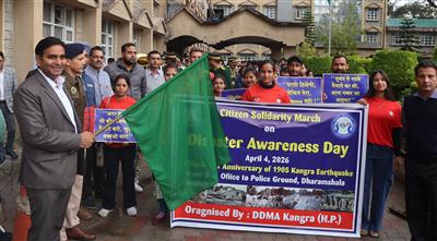 धर्मशाला, 4 अप्रैल: 1905 कांगड़ा भूकंप की 121वीं वर्षगांठ के अवसर पर आज पुलिस ग्राउंड, धर्मशाला में जिला आपदा प्रबंधन प्राधिकरण कांगड़ा द्वारा आपदा जागरूकता दिवस समारोह का आयोजन किया गया। इस अवसर पर उपायुक्त कांगड़ा हेमराज बैरवा ने बतौर मुख्य अतिथि शिरकत की।