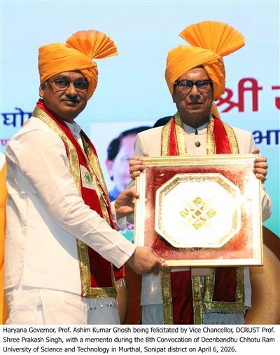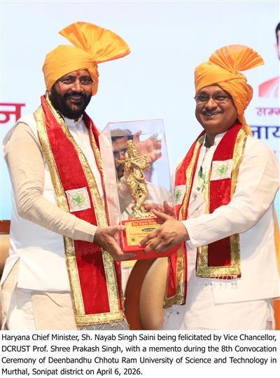 Chandigarh, April 6 — Haryana Chief Minister Sh. Nayab Singh Saini said that today is a milestone in the history of Deenbandhu Chhotu Ram University of Science and Technology (DCRUST) and an unforgettable moment in the lives of students receiving their degrees. The Chief Minister welcomed and felicitated the Vice President of India, Sh. C. P. Radhakrishnan, who attended the convocation ceremony as the Chief Guest. Haryana Governor and Chancellor Prof. Ashim Kumar Ghosh was also present on the occasion.