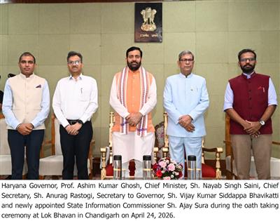 Haryana Governor, Prof. Ashim Kumar Ghosh, Chief Minister, Sh. Nayab Singh Saini, Chief Secretary, Sh. Anurag Rastogi, Secretary to Governor, Sh. Vijay Kumar Siddappa Bhavikatti and newly appointed State Information Commissioner Sh. Ajay Sura during the oath taking ceremony at Lok Bhavan in Chandigarh on April 24, 2026.