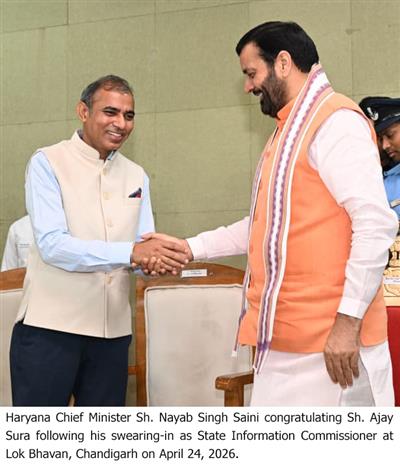 Haryana Chief Minister Sh. Nayab Singh Saini congratulating Sh. Ajay Sura following his swearing-in as State Information Commissioner at Lok Bhavan, Chandigarh on April 24, 2026.