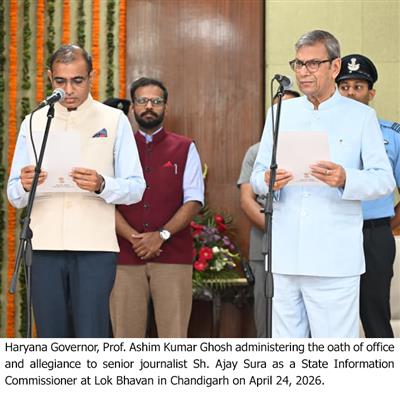 CHANDIGARH, 24.04.26-Haryana Governor, Prof. Ashim Kumar Ghosh administering the oath of office and allegiance to senior journalist Sh. Ajay Sura as a State Information Commissioner at Lok Bhavan in Chandigarh on April 24, 2026.