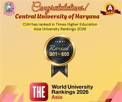 MAHENDERGARH, 24.04.26-The Times Higher Education (THE) Asia University Rankings 2026 have been announced, and the Central University of Haryana (CUH), Mahendragarh, has secured a position in the 501–600 band. This achievement marks a significant milestone in the university’s academic progress.