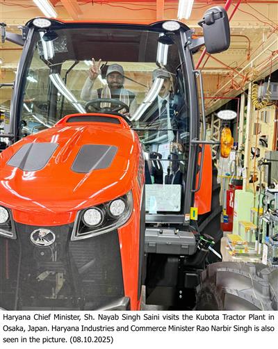 Chandigarh, October 8 — Under the leadership of Haryana Chief Minister Sh. Nayab Singh Saini, the high-level delegation from the state, which is on an official visit to Japan, visited the Kubota Tractor Plant located in Osaka on Wednesday. During the visit, the Chief Minister met with senior officials of the company and held detailed discussions on potential investment and opportunities for technical collaboration in the agricultural equipment manufacturing sector in Haryana.