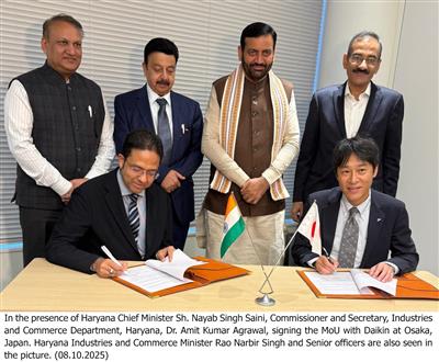 A high-level delegation from Haryana, led by Chief Minister Sh. Nayab Singh Saini, is on an official visit to Japan with the objective of attracting foreign investment and promoting global industrial activities in the state. The MoU was signed today at Daikin Industries Limited’s R&D Centre in Osaka in the presence of the Chief Minister. The MoU was signed by Dr. Amit Kumar Agrawal, Commissioner and Secretary, Department of Industries and Commerce, Haryana Government, and Sh. Shogo Endo, Deputy Managing Director, Daikin Industries Limited.