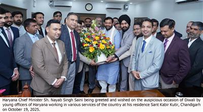 Chandigarh, October 19- On the auspicious occasion of Diwali, Young officers of Haryana origin serving in various services across the country, along with social workers paid a courtesy call on Haryana Chief Minister, Sh. Nayab Singh Saini at his residence, Sant Kabir Kutir, Chandigarh. During the visit, the officers and social workers extended warm Diwali greetings to the Chief Minister and appreciated his leadership in ensuring the state’s continuous development and good governance.