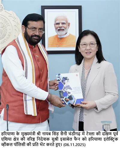 Chandigarh, November 6 - Haryana Chief Minister Sh Nayab Singh Saini, while inviting the world-renowned electric vehicle manufacturer Tesla to establish a manufacturing plant in Haryana, stated that the state government is committed to providing full support to promote electric vehicles and attract industrial investment. He also presented a copy of the Haryana Electric Vehicle Policy to Tesla representatives and highlighted that Haryana is rapidly emerging as a leader in this sector.