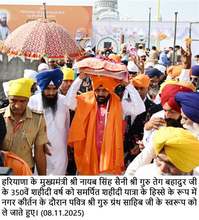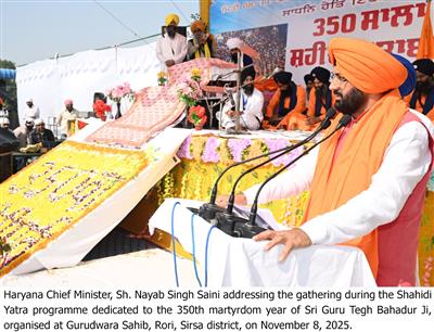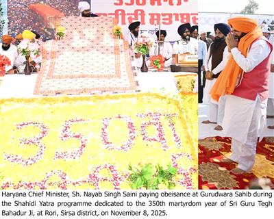 He informed that programmes commemorating the 350th martyrdom anniversary of Sri Guru Tegh Bahadur Ji began on November 1 and will continue until November 25, with the main event to be organized in Kurukshetra. The Chief Minister said that four religious processions (yatras) will be taken out, the first of which was flagged off today from Rori in Sirsa district.