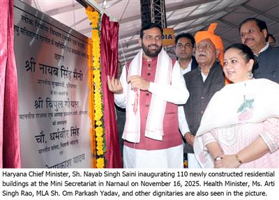 The Chief Minister inaugurated 110 residential quarters for officers and employees at the district headquarters in Narnaul, constructed at a cost of Rs. 3,595.65 lakh. He also inaugurated the Trauma Centre in Narnaul built at a cost of Rs. 656.41 lakh; road construction and beautification works from the Women Police Station to Girls ITI costing Rs. 280.25 lakh; construction of two parks in Narnaul city at a cost of Rs. 234.76 lakh; three-bay bus stand in Nangal Chaudhary costing Rs. 228.47 lakh; road works from the Women Police Station to Agrasen Chowk in Narnaul costing Rs. 116.25 lakh; construction of the Administrative Block at Government College Ateli costing Rs. 100 lakh; park in Chitwan Vatika, Narnaul costing Rs. 90.41 lakh; a park near Sati Mata Mandir in Ward No. 13, Narnaul costing Rs. 71.81 lakh; GVH in Azmabad Mokhuta costing Rs. 40.29 lakh; GVH in Meghot Halla costing Rs. 35.83 lakh; the GVH in Kamania costing Rs. 35.83 lakh; the GVD in Jhook costing Rs. 32.58 lakh; the GVD in Kheri costing Rs. 31.11 lakh; and the GVD in Dhana costing Rs. 31.11 lakh.